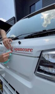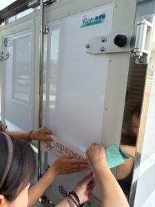 こちらの写真は、新車導入時のスパンコアステッカー貼の儀式の様子です。
