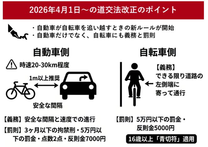 2026年(令和8年)4月1日から、道路交通法改正により自動車が自転車を追い越すときの新ルールが始まります。